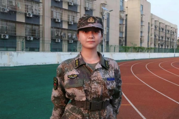 军训期间烈日暴晒是常态,但何柏依从未因此喊苦喊累。高温三十多度的天里,她始终一丝不苟地穿戴好全套迷彩军装。绝不脱帽,绝不打伞,纵然额前头发已湿透,纵然汗滴从脸颊不断划过,她始终心无旁骛地指导同学们训练。