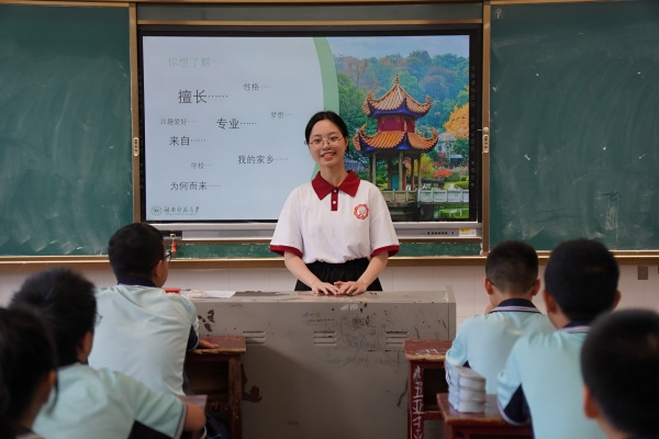 从学生工作的方寸天地出发,上官思涵将脚步迈向了社会实践的广阔原野。她以脚步丈量山河,在两度“三下乡”实践中扎根支教岗位,从城步苗乡到益阳乡镇,触摸教育最本真的温度。城步的支教教室简陋质朴,没有窗帘遮挡烈日,没有空调驱散酷暑,午休时,她与队友为班上学生扇风降温,将细碎清凉悄悄送进孩子们的梦乡;班里有一名调皮的男孩,课上心不在焉,课下常围在她身旁絮絮叨叨,她耐心引导、温柔以待。后来,她在教师节收到了一份跨越山河的祝福,这份双向的真诚感情,成为了她支教路上最珍贵的馈赠。大二赴益阳武潭的支教经历,更是在她心中留下了深刻印记。送别时,当地孩子们顶着四十多度高温在校门口久久不愿离去,一声声“明年还来吗”的追问,让她读懂了乡村教育的缺口与孩子们对知识的热切期盼。她与搭档悄悄为每个学生拍摄了单人照、制成专属的明信片留作纪念。小小的卡片成为了乡土间最温暖的羁绊,也让她豁然开朗:教育的本质,从来不是单向的知识灌输,而是用真心换真心的双向陪伴与守护。