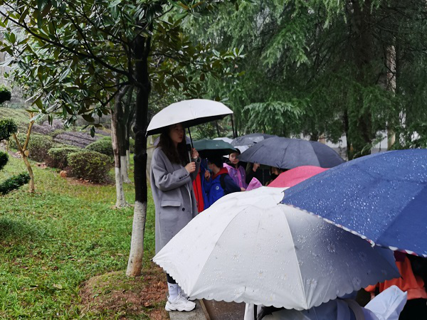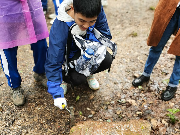 室内参观和讲解的环节结束后,室外的雨却并没有停下来的意思,似乎下的更加肆意了些。可来参加研学活动的同学都纷纷表示想冒雨坚持完成这次旅途学习。随着一把把雨伞的撑开、绽放,一条浩浩荡荡的游学队伍在雨中满怀坚定地踏上了岳麓山实地研学的旅程。在泥泞坑洼的山路上,同学们虽然得小心地关注脚下打滑的路,但还是认真地听志愿者老师们对每一个地理现象的讲解。从“棕榈”、“芭蕉”的植被特性的讲解辨认,到“背斜”“向斜”这些平日里学习到的熟悉而又陌生的知识,在地科院志愿讲解员的讲解下,以更加直观直白的形式呈现在同学们的面前