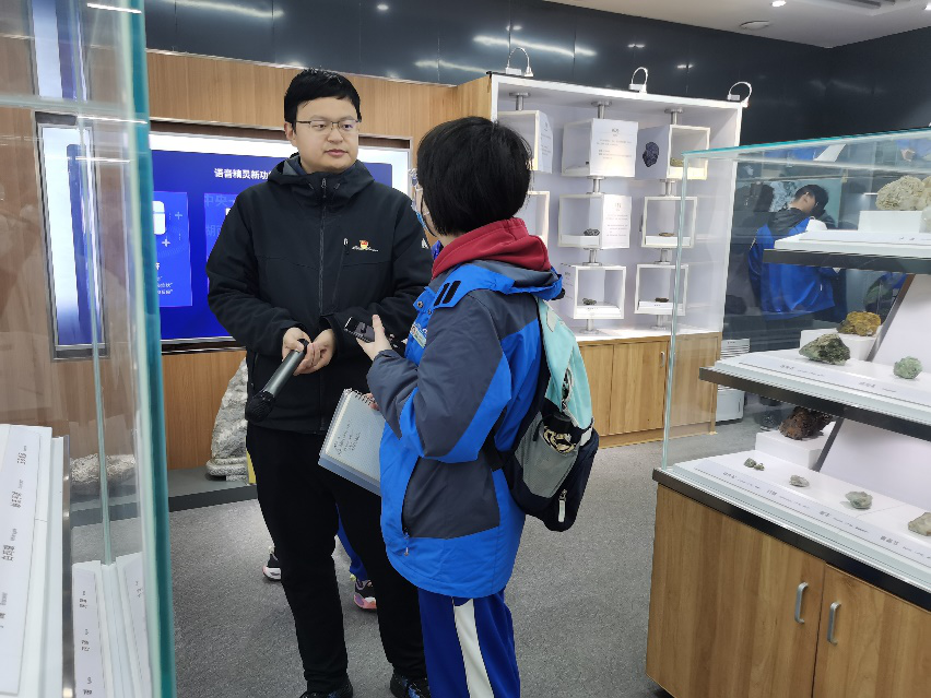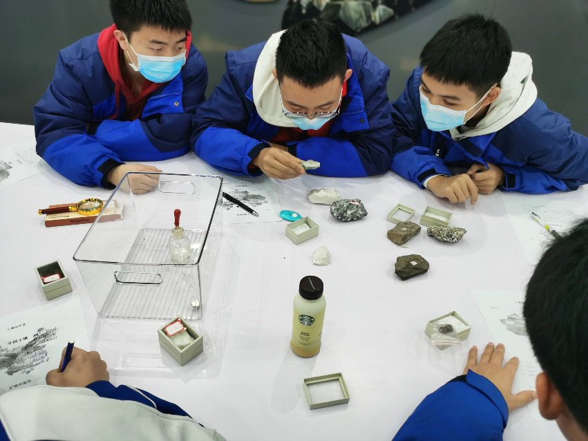 研学旅行不仅要有旅,更要有研,要给予学生自主探究的时间和空间,才能使学生学有所思、学有所得。因此在讲解完地标馆的展品后,志愿者和老师们带着同学来到旁边的多媒体教室重点讲解矿物和岩石的有关知识。在讲解矿物和岩石时,联系学生已有知识基础,结合实际看到的岩石矿物标本,由学生自己动手,通过实验探究来判断事先的分类是否正确,再由志愿讲解老师加以讲解,校对答案。每一个动手实验环节,同学都充满了对实践和知识的热情。课堂在志愿讲解老师的带动下充满了活跃的氛围。