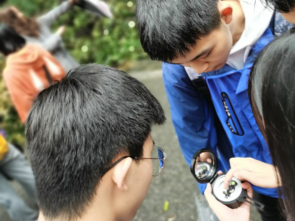 除此之外,地科院在此次研学旅途中还安排了与讲解相辅的“实践环节”,在志愿者的指导和安排下。同学们学习并实践了岩石的开采和罗盘的坡度测量。