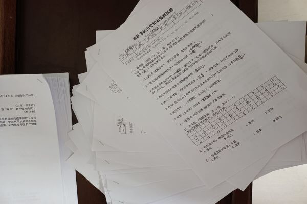 小理事们各司其职,分工明确,有条不紊。其中两位小理事负责这次社团活动的重要道具——历史知识试卷。历史知识试卷已精心的整理整齐,等待着同学们的到来。一题又一题,深刻而又有意义,体现着春秋学社对历史的严谨态度。