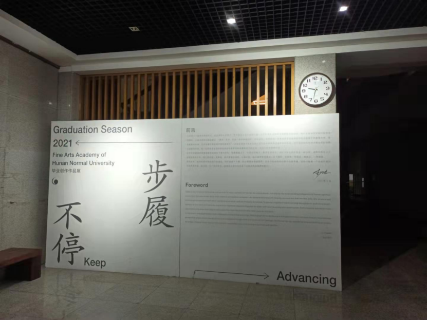 来到美院美术楼的大厅,映入眼帘的是21年毕业创作作品展的展牌。极简而极具设计感的展牌上有着学校对毕业学子们的寄语:步履不停。对于毕业的学长学姐们,离开学校的大门意味着新的征程,仍需不断开拓进取,而对刚入大学的小萌新们又何尝不是一种新的考验,在接下来的学习生活中,师大学子亦将步履不停。