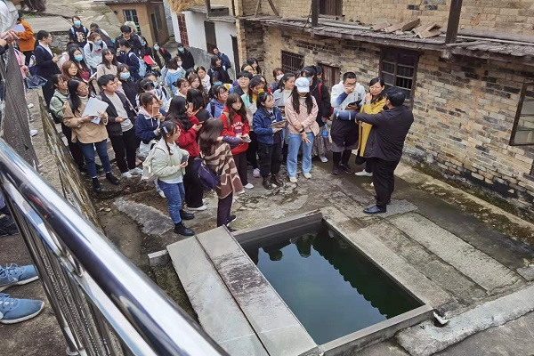 下午,同学们来到了风水村钟家湾,一个距离张谷英村很近的村落。同是明清建筑群,风水村荒凉破败,少有人居住。同学们从村干部的口中了解到现状:风水村没有保护资金,村里人大多进城务工了。走过厅堂屋,同学们在一口水井前停下了脚步。这口井比地表还要高出一段,由于所处地势较高,用以汇水,为居民提供消防和生活用水。这口井虽是古井,却丝毫没有古色古香的气息了,还有一半的构造是混凝土,水质也不佳。朱佩娟老师耐心地为同学们解释了相关原因:钟家后人对古井进行了不正当的维修,改变了其天然构造,污染了水质。由此可见,传统村落的保护是一门技术,绝不可鲁莽行事,古建筑的任何一种破坏都会给人类珍贵的文化财富带来巨大损失。