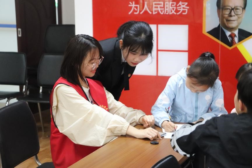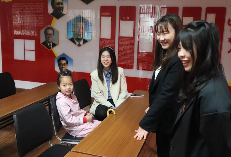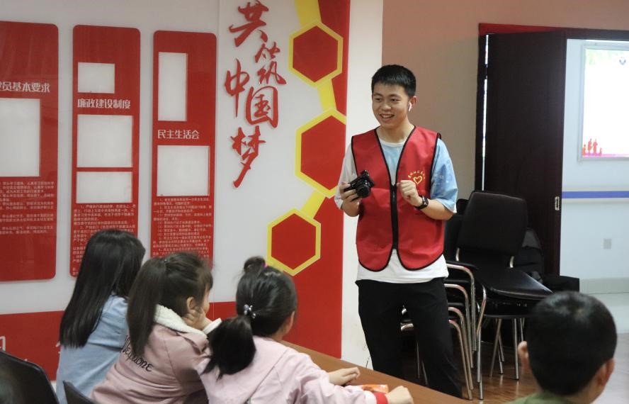 在一方小桌子旁,大学生为小朋友精心讲述着百年前的故事。唐诗雯同学用互动提问的方式引导小朋友理解社会主义发展史,傅一晨同学讲述的是党史,“红军不怕远征难”,“万水千山只等闲”小朋友大声接上下句诗词,通过诗词背诵和长征故事激发了小朋友对中国共产党诞生以及发展的兴趣。