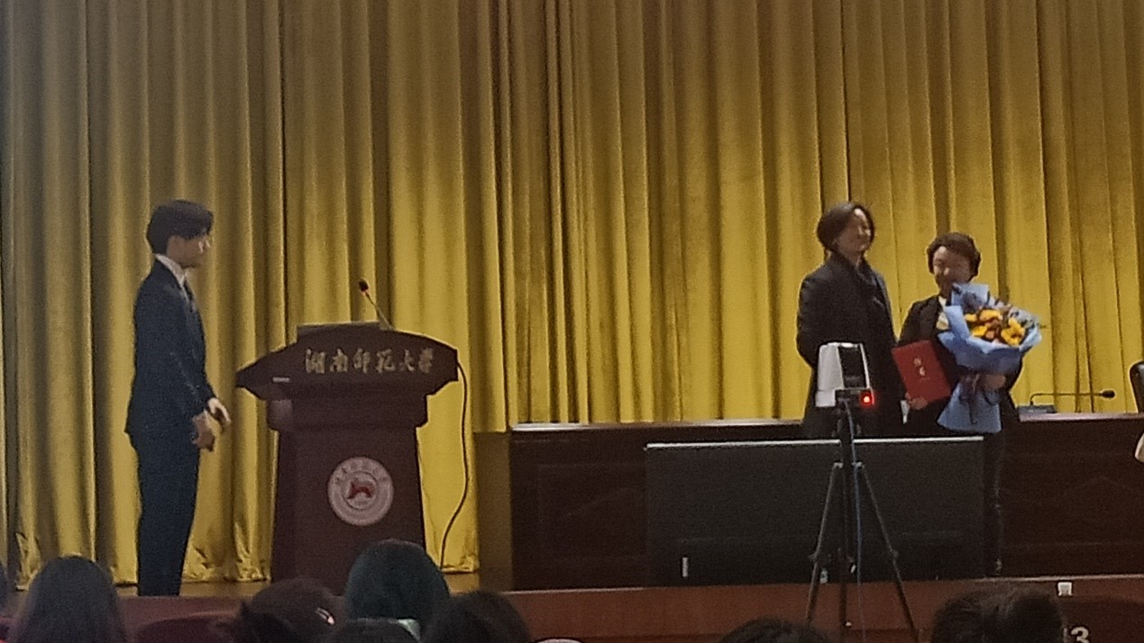张燕教授的讲座结束后,我校为她颁发聘书,由学生代表为她送花,感谢她教会学生们正确看待自己,与自己和解。