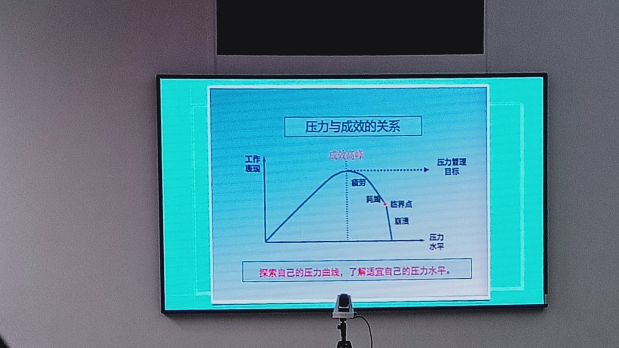 张燕教授向同学展示了一张曲线图,图中描述了压力与成效的关系,张燕教授还鼓励同学们积极探索自己的压力曲线,了解适宜自己的压力水平。