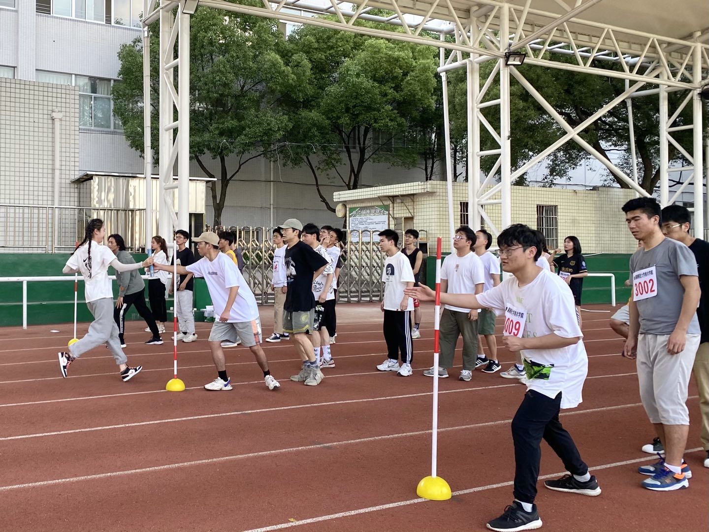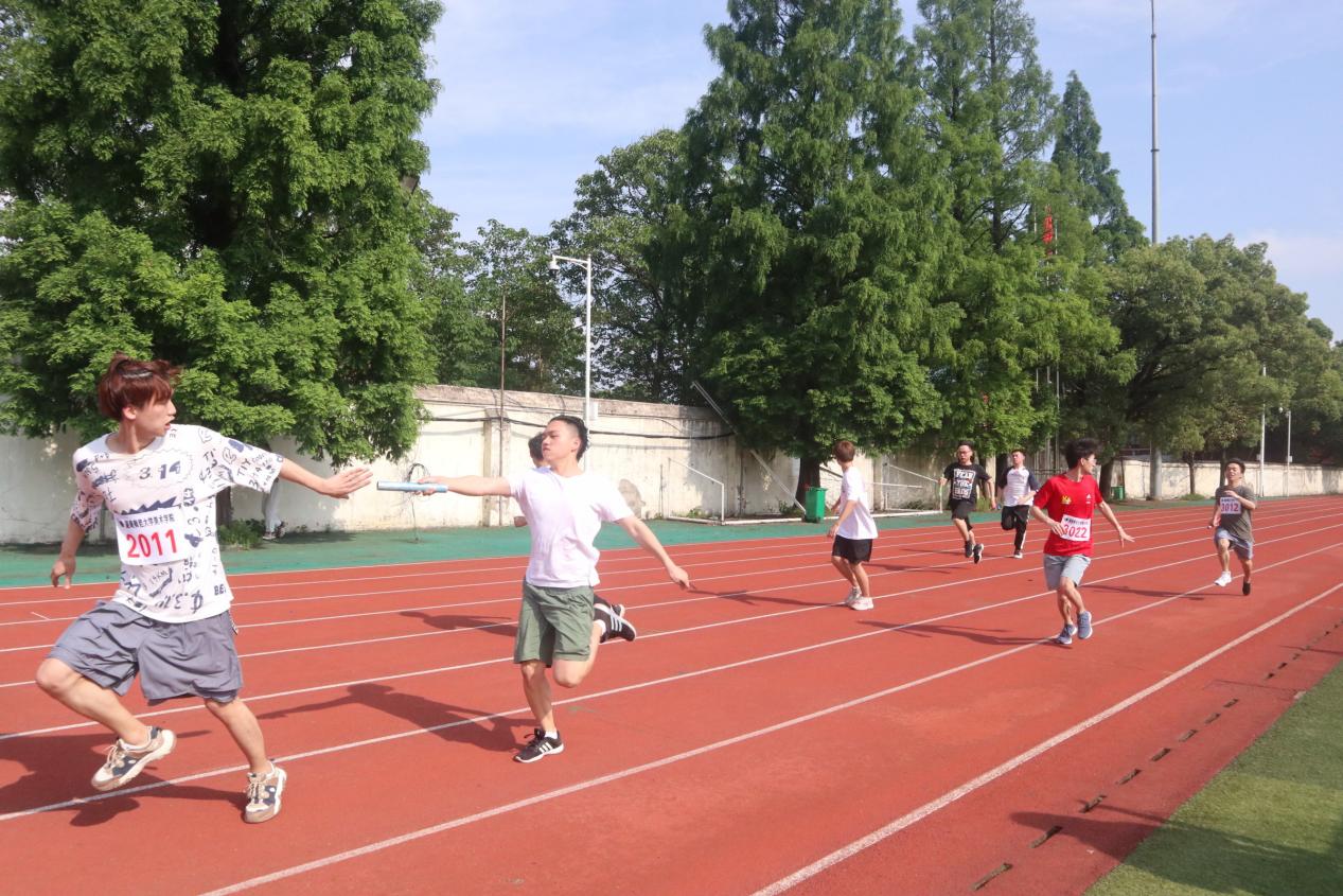 天公作美,春日的阴雨退去,放晴的天空下,4X100m的选手们互相合作,集中精力,紧盯队友身影,在赛道上冲刺。
