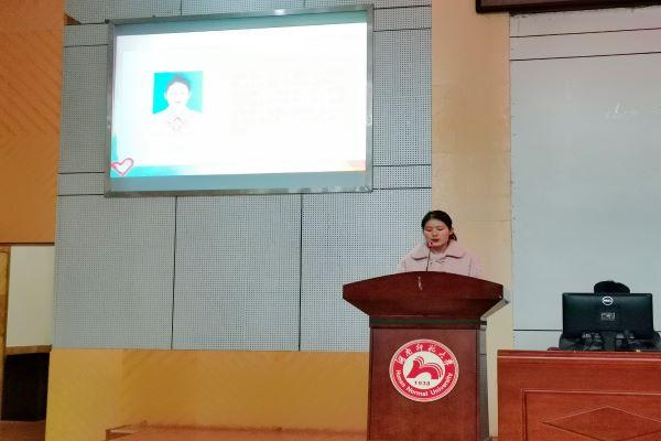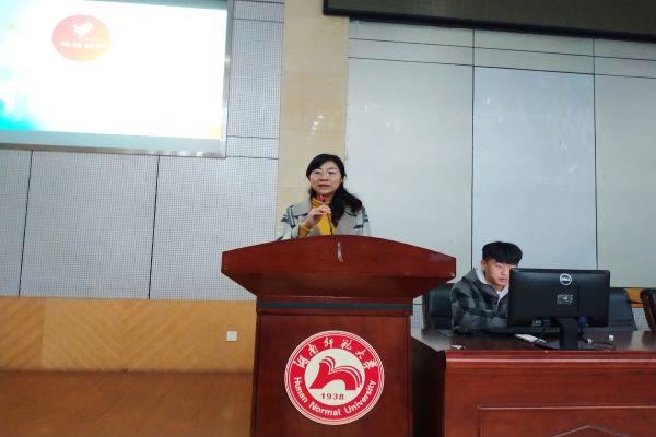 团委王静老师致词,在感恩节之际,王静老师说:“以自己的行动帮助需要帮助的人”,告诉在座的每一位同学,要用自己的方式感恩社会,服务社会,用自己的力量来温暖身边的每一个人。