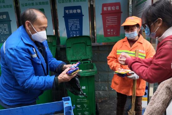 去到后门的志愿者们先是来到了湖南省胸科医院附近,一路上,志愿者们碰到了许多奋斗在工作岗位的环卫工人。他们有的正在打扫街道卫生,有的在将垃圾分类整理。