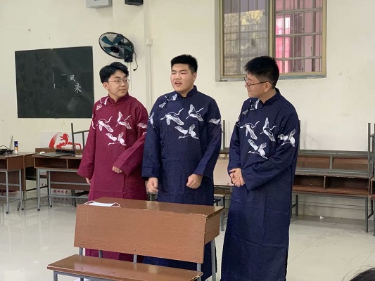 三位北方男生,身着长袍,往台上一站,字正腔圆地讲起了相声。他们表演的节目是《借口罩》。他们自己编写剧本,自导自演,相声韵味极佳,让人拍手叫绝。