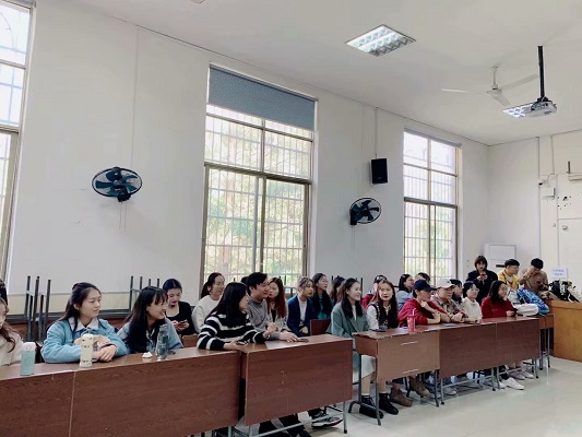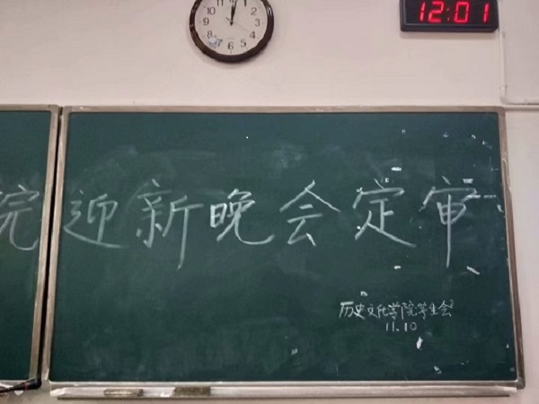 中午十二时许,学生会的各个同学便早早来到了历文院的411教室布置会场。学生会各部干事分工合作:有人负责道具搬送,有人负责音频调适,有人负责入场引导。他们各司其职、做事井井有条。会场早早被布置好,黑板上写下“历文院迎新晚会定审”几个大字。