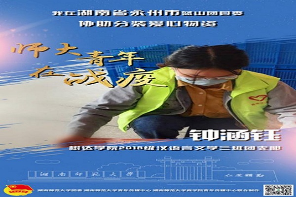 2018级汉语言三班的钟涵钰同学,在人心惶惶的疫情期间,持续参与防疫宣传,社区消毒,人员筛查,物资保障和爱心助农等工作。“新时代青年要勤于学习,敏于求知,既要专攻博揽,又要关心国家,关心人民,关心世界,学会担当社会责任。”这是习近平总书记寄予的期望,也是钟涵钰作为新时代新青年的使命。