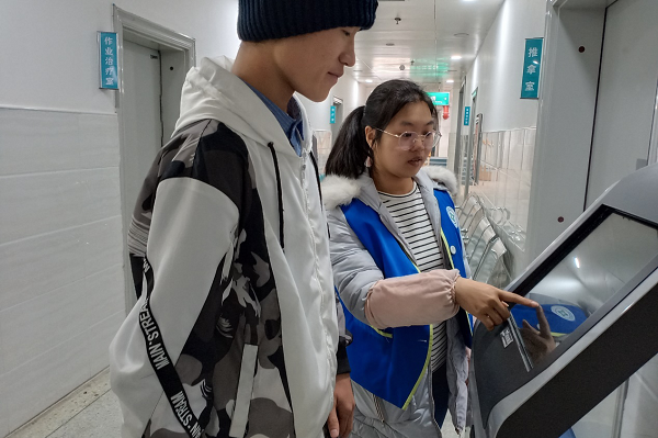 培训会结束后,“热心导诊,关爱随行”志愿活动正式开始,下午志愿者们穿上蓝马甲在四医院开始了志愿服务工作。活动中志愿者们耐心解答问诊病人的问询,主动搀扶行动不便的病人,帮助问诊病人解决问诊机器挂号和缴费服务中遇到的困难,减轻了四医院医护工作者的负担。