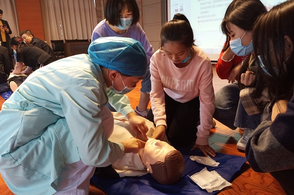 志愿者们在观看完急救演示之后,开始进行心脏复苏的实践操作学习,“白金十分钟”成员对志愿者的疑问进行了详细解答,对志愿者们的急救动作也做了细心的指导。通过对“模拟人”实施心脏复苏抢救操作,志愿者们初步了解了基本的心脏复苏技术的操作要点及注意事项。