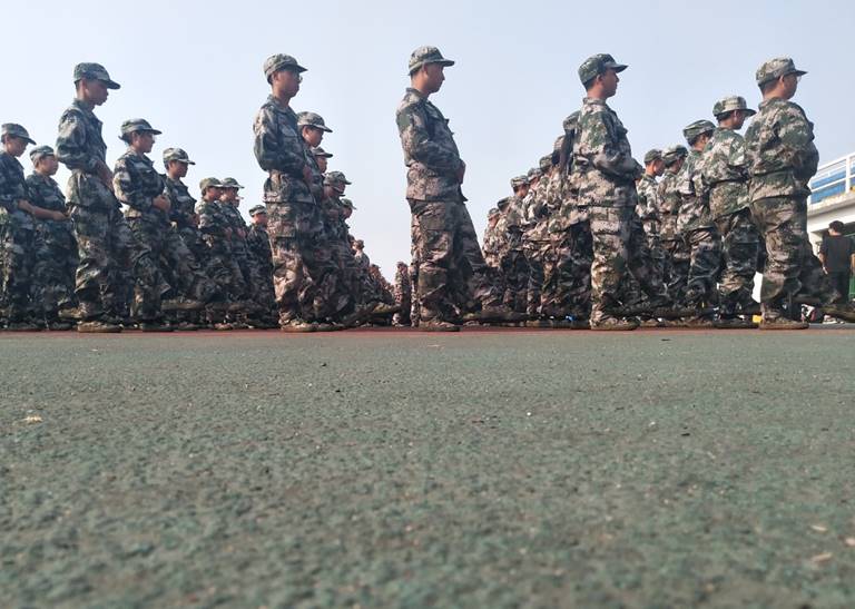 午后两点是一天中最热的时候,19级的新生们依然穿着厚重的军训服继续训练。