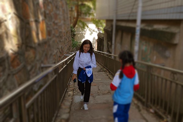 西斜的阳光洒在归途的阶梯上,结束了一天工作的徐老师接了孩子,准备要回家了。她要为一家人做一桌香喷喷的饭菜。
