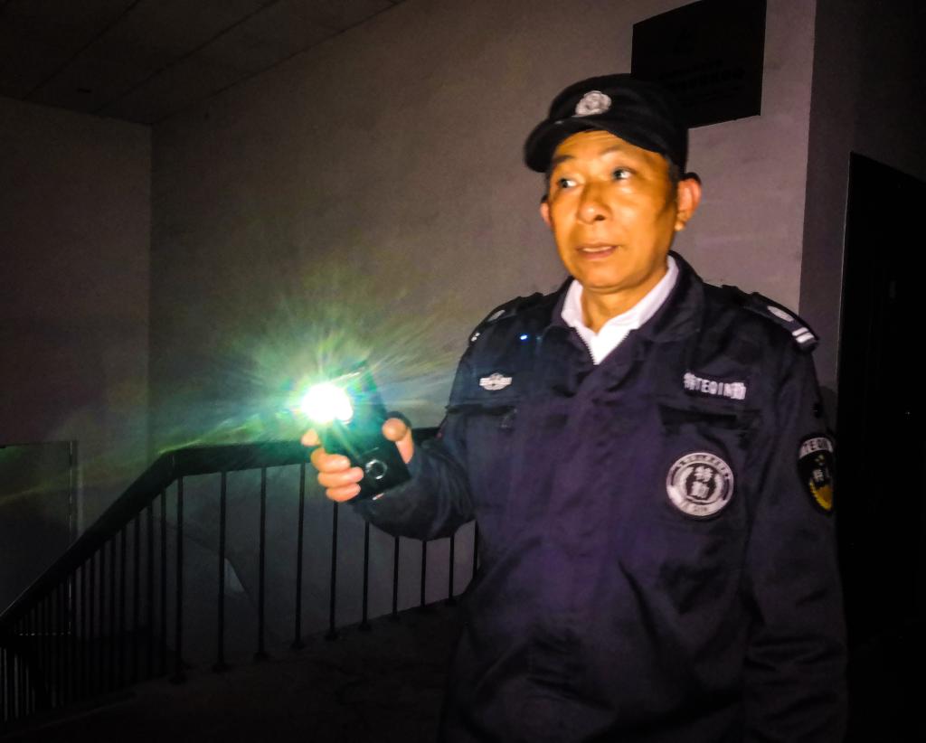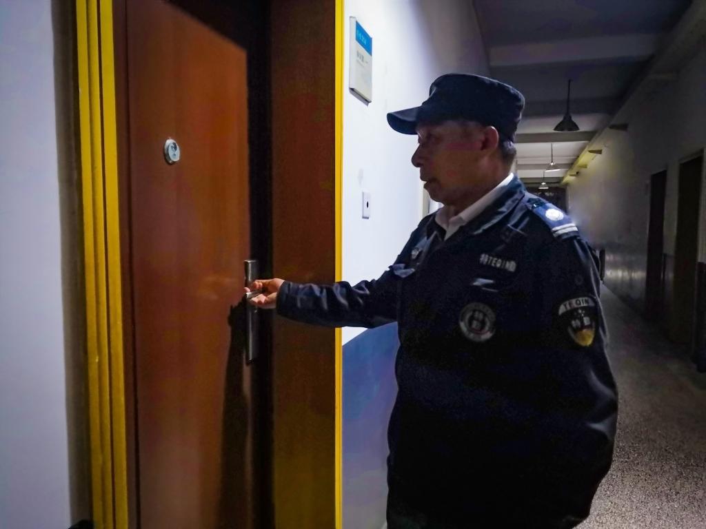 在12点后睡觉时,他还是时刻保持着警惕。可以说他是24小时工作,当笔者问到他这样工作累不累时,他回答说到:”这没什么,我工作完全是为了学院的安全,只要学院没出什么安全事故,我工作累一点也是小事。“