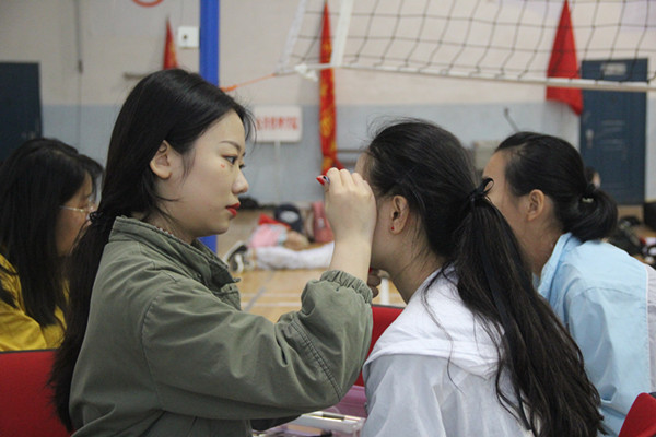 比赛开始之前,队员们认真的打扮着。精致的妆容和整齐的服装,使整个队伍的精神面貌焕然一新。
