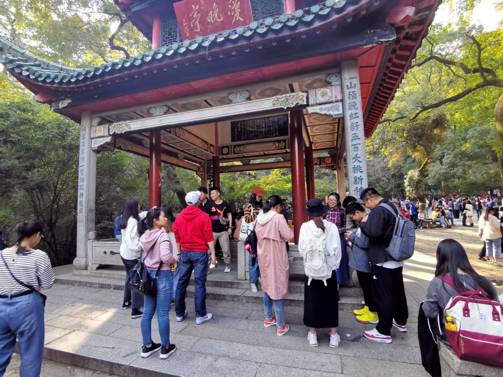 会员们停下脚步,近距离观赏麓山枫红、爱晚亭楹联。分散拍照后静心体会盎然秋意,最终在爱晚亭前合影留念。