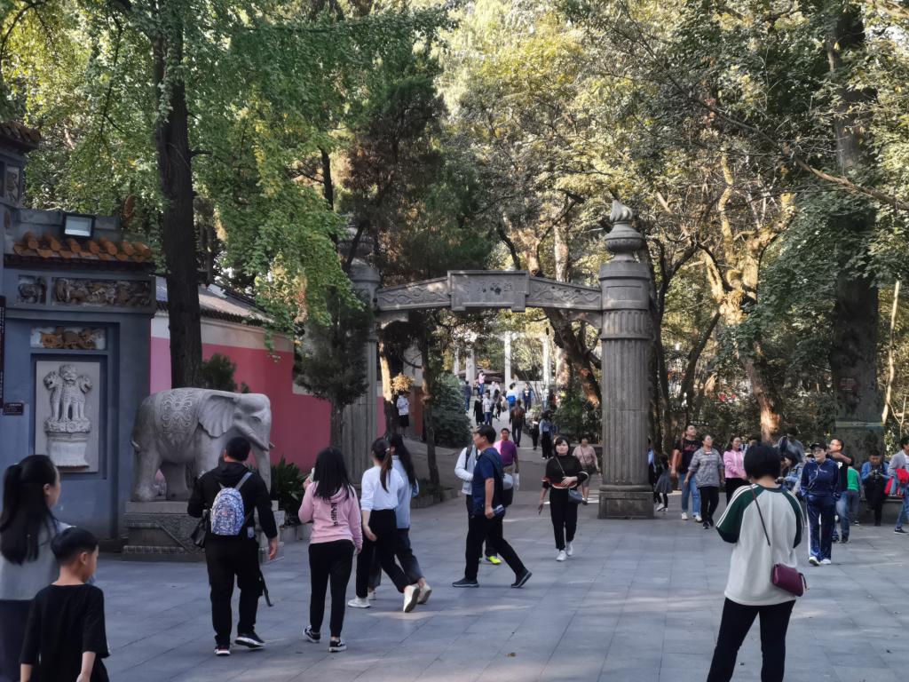 会员们在山中漫步,感受绿树红墙的和谐之美与宁静清幽的氛围。会员们在山腰处稍作休息,又接着沿林间小径向山顶攀登。