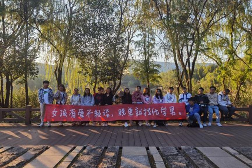 前往洋湖公园的路途中滕蜜组织同学们在桃子湖为2002班男生拉了横幅“女孩子有爱不轻谈,脱单就找化学男”并为2002班的全体同学拍了照片,促进班级同学深入交流,增强了班级凝聚力。