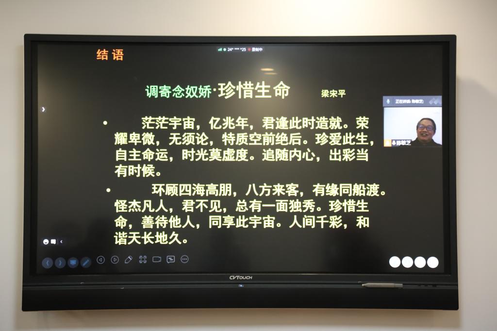 关于历史长河中每个人的唯一性这个结论的推理与联想中,梁宋平强调同学们要珍惜自己的人生,即使境遇艰难,仍然值得自爱,并要敢于听从内心的呼唤,坚持做自己。同时,他还向同学们展示了自己作的诗《调寄念奴娇•珍惜生命》,呼吁同学珍惜自己,善待他人。