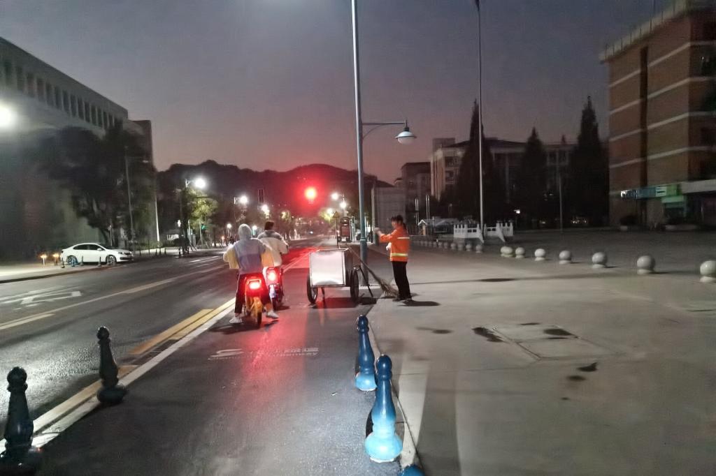 在寒冷的早晨2004班的同学们骑上电动车去寻觅环卫工人的身影,五点多的清晨天还麻麻亮,且满带寒意,可想环卫工人的辛苦。静谧的早晨环卫工人便已经在默默无闻地工作了,幽静的路上不时能看见他们的身影。