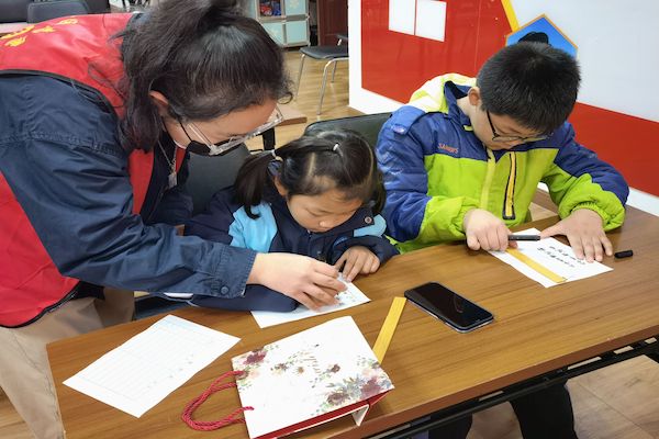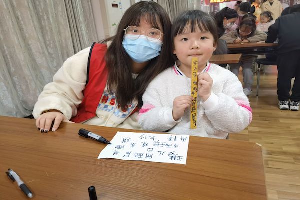 年纪小的孩子们或许会遇到不会写的字,正因如此,志愿者们也基本保证了简牍制作过程中孩子们基本上都有人陪伴,志愿者一对一地辅导孩子。可以看到白纸上除了孩子们自己的草稿外,也有不少是在志愿者帮助下写好的生字。