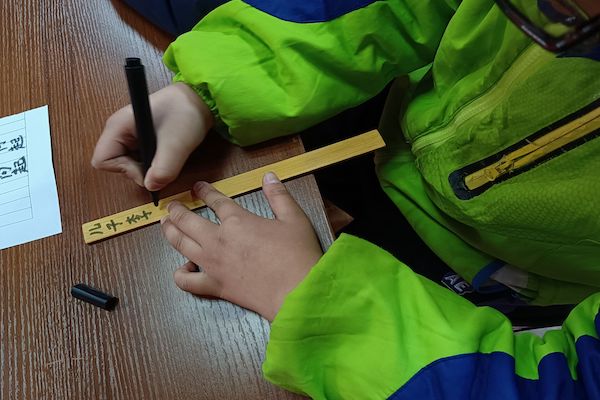 志愿者全程陪伴孩子们制作简牍,手把手地教他们如何编排好文本草稿。而孩子们也在努力制作,一只小手紧紧攥住油性笔,另一只小手则负责压住简牍防止它乱动。孩子们写字是极认真的,个个埋着头,暗暗发力,每一笔都是有力的落下,尽自己的最大的努力制作好简牍。