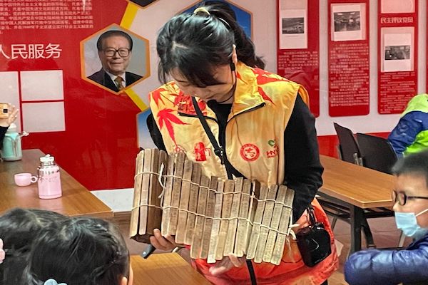 来自长沙简牍博物馆的主讲老师为孩子们展示简牍,卷好的简牍册在老师手中缓缓展开,映入孩子们眼帘:简牍的竹片因历史的积淀而发黄发青,简牍上的黑字因时光洪流的冲刷而渐浅。当它真正出现孩子们眼前时,他们的热情似乎被添了把柴,到达了顶峰,对于接下来要制作简牍的活动开始摩拳擦掌、跃跃欲试。