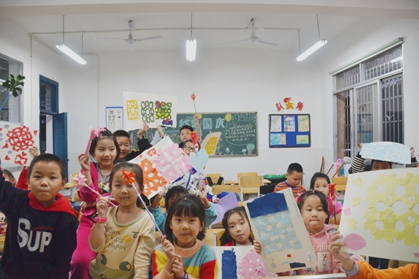 孩子们在课程结束对着镜头展示出自己的作品。志愿者们在活动结束后表示“开设趣味美术课程的目的主要是让学生们放松,在娱乐中寻找乐趣,同时培养其审美能力。”