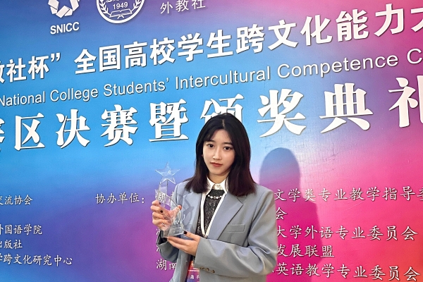 因为热爱,所以选择。或许是因为美剧的启蒙,方伊澄对英语产生了极大的兴趣,也坚定了她学习英语的信念,进入大学以来,方伊澄连续三年获得一等奖学金。勤而后熟,熟而后巧,巧而后妙,方伊澄在参加“外教社杯”湖南省高校学生跨文化能力大赛后,获得了省级特等奖。谈起这项比赛经历,方伊澄分享了她的心路历程:“人外有人,天外有天。”只有不断地去充实自我,才能够在众多优秀的人中脱颖而出。