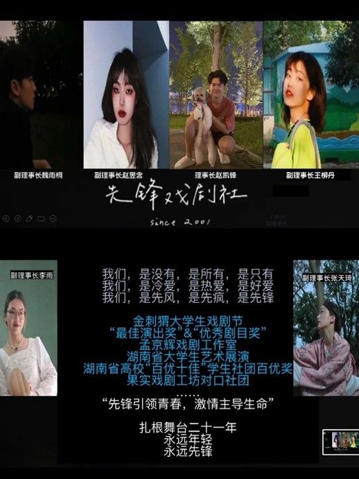 先锋戏剧社成立于2001年,成立以来获得过国家级第十一届“金刺猬”大学生艺术节“最佳演出奖”及“优秀剧目奖”、北京大学生戏剧节一等奖等奖项。