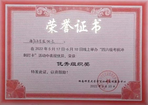 6、2022年获得共青团湖南省委颁发的湖南省志愿服务大赛金奖(省级);