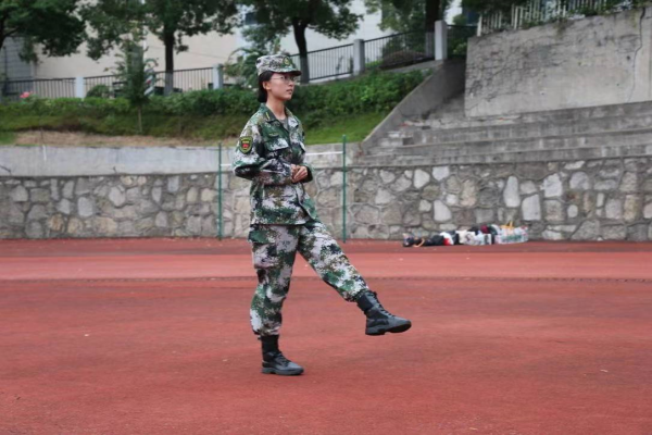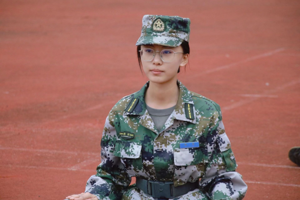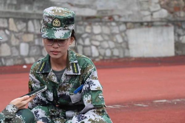 乌云密布,道路两旁的树叶被微风轻拂。一路向前,时光会清晰地记下施颖最美的样子:“立如芝兰玉树,笑如朗月入怀。”当被问及为什么会继续选择做带训教官时,她微微一笑,娓娓道来:“因为我觉得这是一次很好的机会,也是一次难得的体验,我想继续带训。”这是施颖第二次当军训教官,她说:“与第一次相比,这次我做事和带训的方法都成熟了很多,我也更加利落了。”她讲完这些,沉默良久,一改先前模样,思绪仿佛飘回不远的夏天。“起初我打算去警校学习,但因为身体原因和心理原因,最终未能进入校门。这令我有些遗憾。现在我可以担任带训教官,也算实现了梦想的一部分。”那个瞬间,阴霾散去,时间开始流逝。在过去的今天,她像其他人一样参加军训,她的心中也埋下了当军训教官的小小种子。如今她抓住机会,完成了从新生到教官的角色转变。